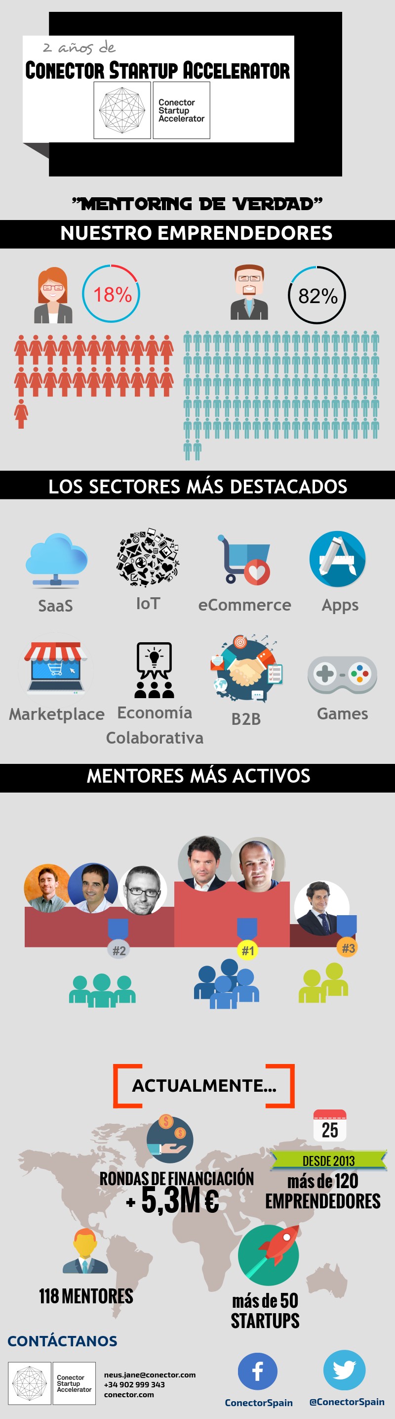 After two years in business and 5.3 million euros raised in funding to its entrepreneurs, Conector has already accelerated more than 50 start-ups in six different programs. In spite of being new as an accelerator in Spain, they have worked with start-ups in eight different sectors, including SaaS, IoT, e-commerce, Apps, Marketplace, Sharing economy, B2B and gaming.