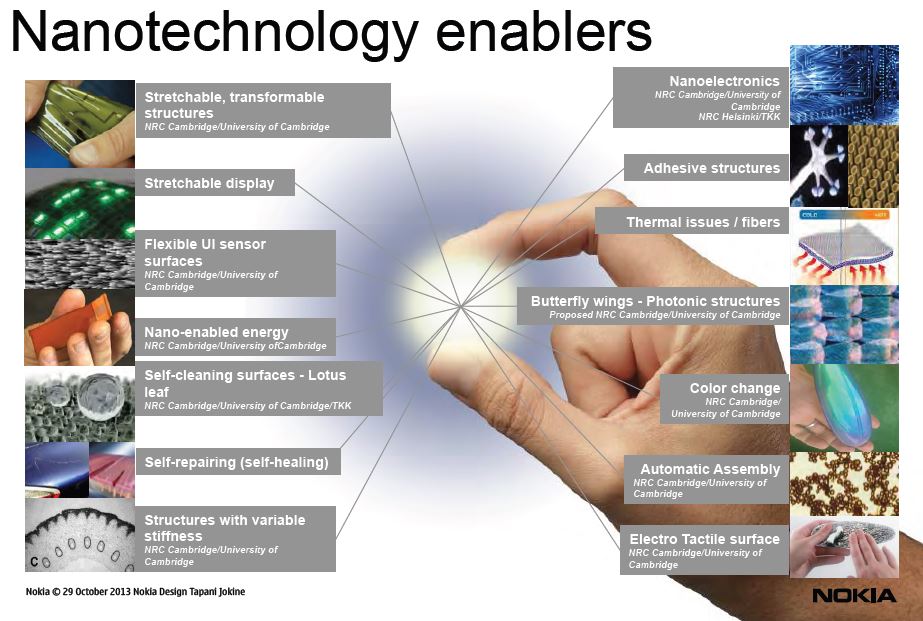 We are going through the flexible device revolution making the border between physical and digital disappear. The hardware side of the industry used to be static, but now with design and artists it is becoming stretchable and flexible. New material properties create new values: transparency, color changing, conducting, transformable, lightweight, harvesting and storage energy. Nanotechnology enablers play an important part in such. Nokia made a very nice slide about it and has a magnificent prototype: IHO. Take some time to examine it! There will be a switch from rectangular structures to organic structures: new free or even floating shapes. The future is not linear. Shape will become a living thing. It is around the corner. Hopefully, someone will bring it into the room.