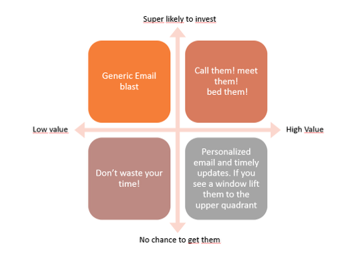 The fact is that asking for money makes many people feel uncomfortable and it’s easy to keep on postponing a phone call or a spammy email. If you are leading the round, then consider the rest of the team as your salesforce. Define weekly targets and personal quotas. This, of course, has to be decided as a team, but then you will have to push them to reach their goals.