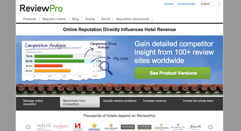 ReviewPro is utilized by hotels worldwide to help manage their online reputation and online presence. The platform provides analysis, customer intelligence, competitive benchmarking and reporting which enables them to manage their business more effectively. ReviewPro aggregates hundreds of millions of social media mentions, in 35+ languages, from hundreds of the most relevant Online Travel Agencies (OTAs), review websites and social media platforms. They have clients in over 80 countries, including Louvre Hotels Group, Meliá Hotels International, The Red Carnation Hotel Collection, The Roger Smith Hotel, CitizenM Hotels and Apex Hotels.