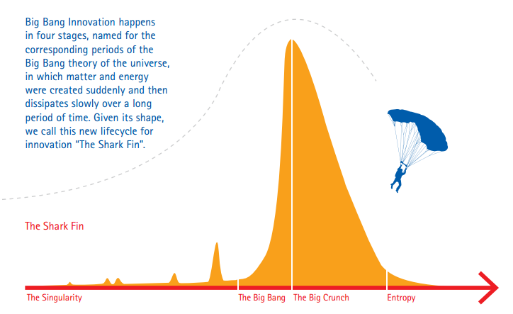 To be prepared for radical changes, companies should implement ‘Shark Fin’ radars. The early warnings of ripples on the surface should be taken seriously. The old adoption curve isn’t applicable to fast changing technologies. If it hits, the impact will be huge. One refers to this as Big Bang Innovation.