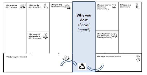 So how can social impact be integrated in the business model? Ever since the Business Model Canvas was introduced in 2010, it has been a popular tool in workshop sessions to define business models and to see what opportunities exist to innovate the business model. I would propose an addition to integrating the social component and make it core to a business model. It should have a position next to value proposition, which is focused at the user. The social impact refers to the value to the world. However, it has deeper implications than the value proposition. The social impact interferes with the cost and revenue structure. New mechanisms are being defined and the clear cut between costs and revenue might become more permeable. Think about the crowd funding and revolving funds. The benefit of including social impact already in the core of the business models is that assumptions are made explicit, accountable and clear to communicate.
